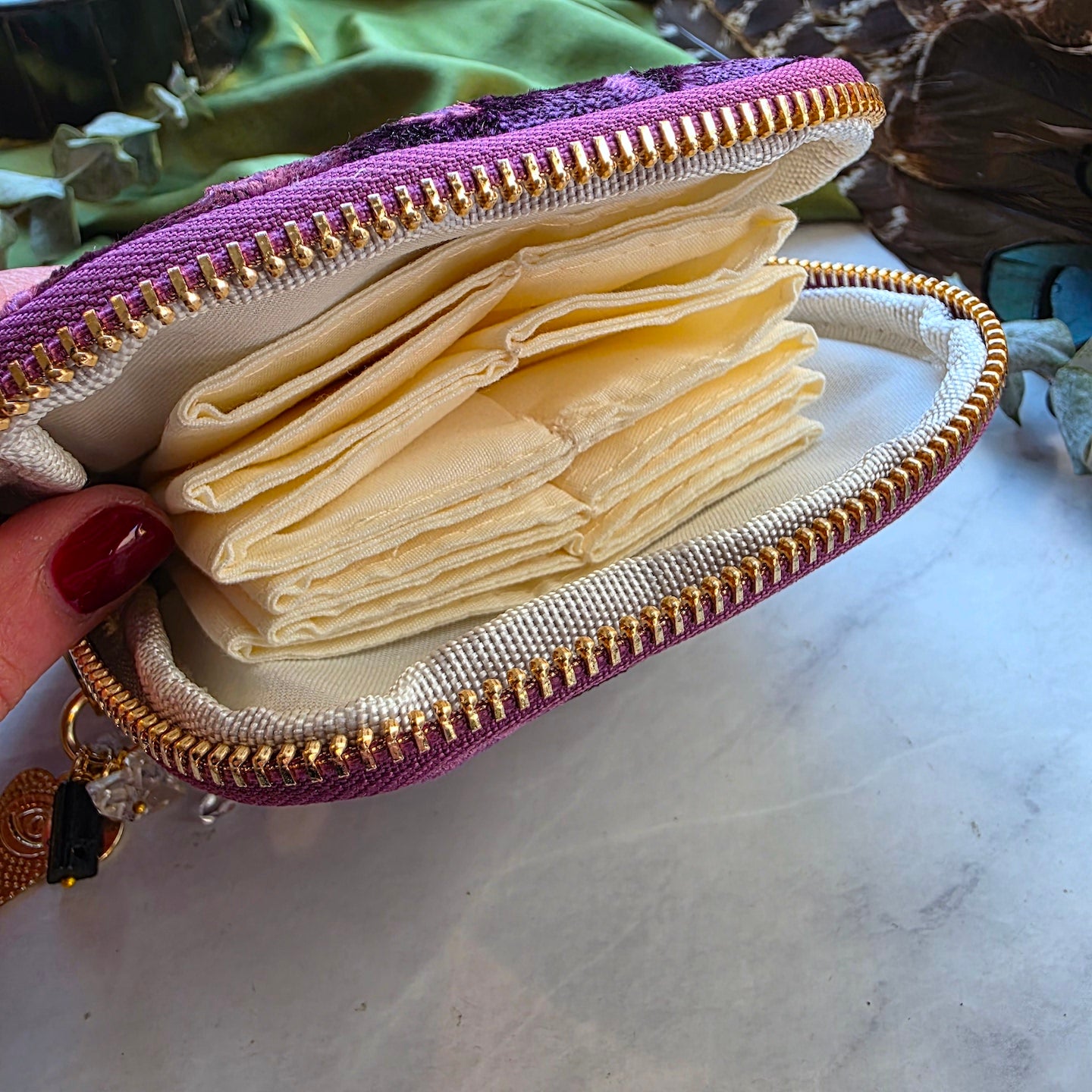 It featureseight cozy compartments keeps your jewelry pieces happily separated and protected, wrapped in the softest chenille velvet you'll ever touch. Padded walls cushion your treasures like a cloud, while a sturdy zipper locks everything in place for worry-free travel.