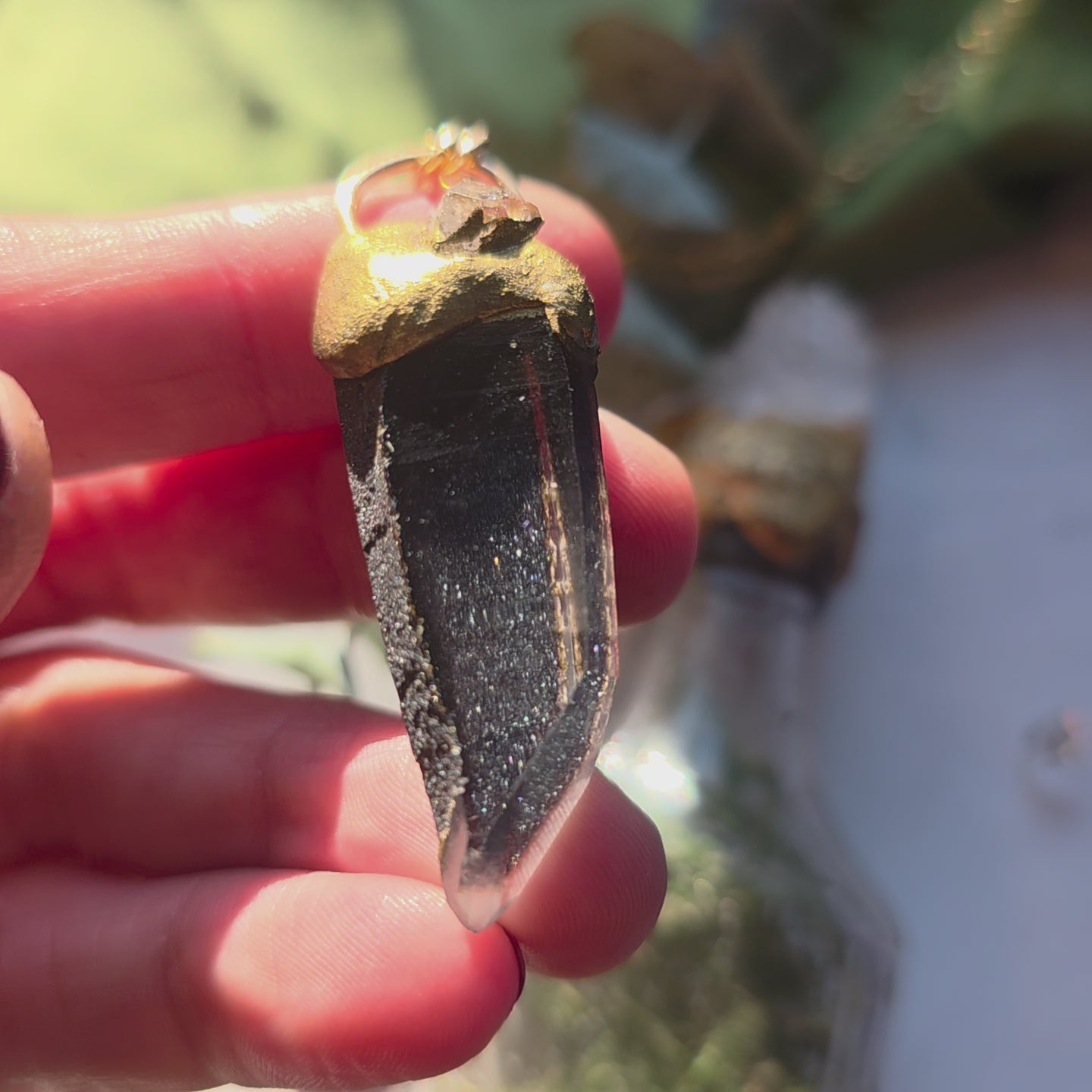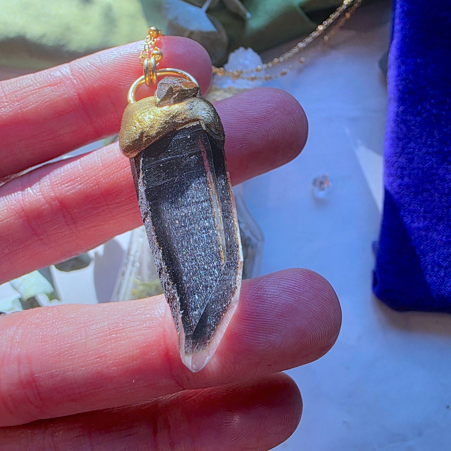 A natural laser Lithium Quartz encrusted with Hematite glitter giving it ultimate clear calm and protected vibes.